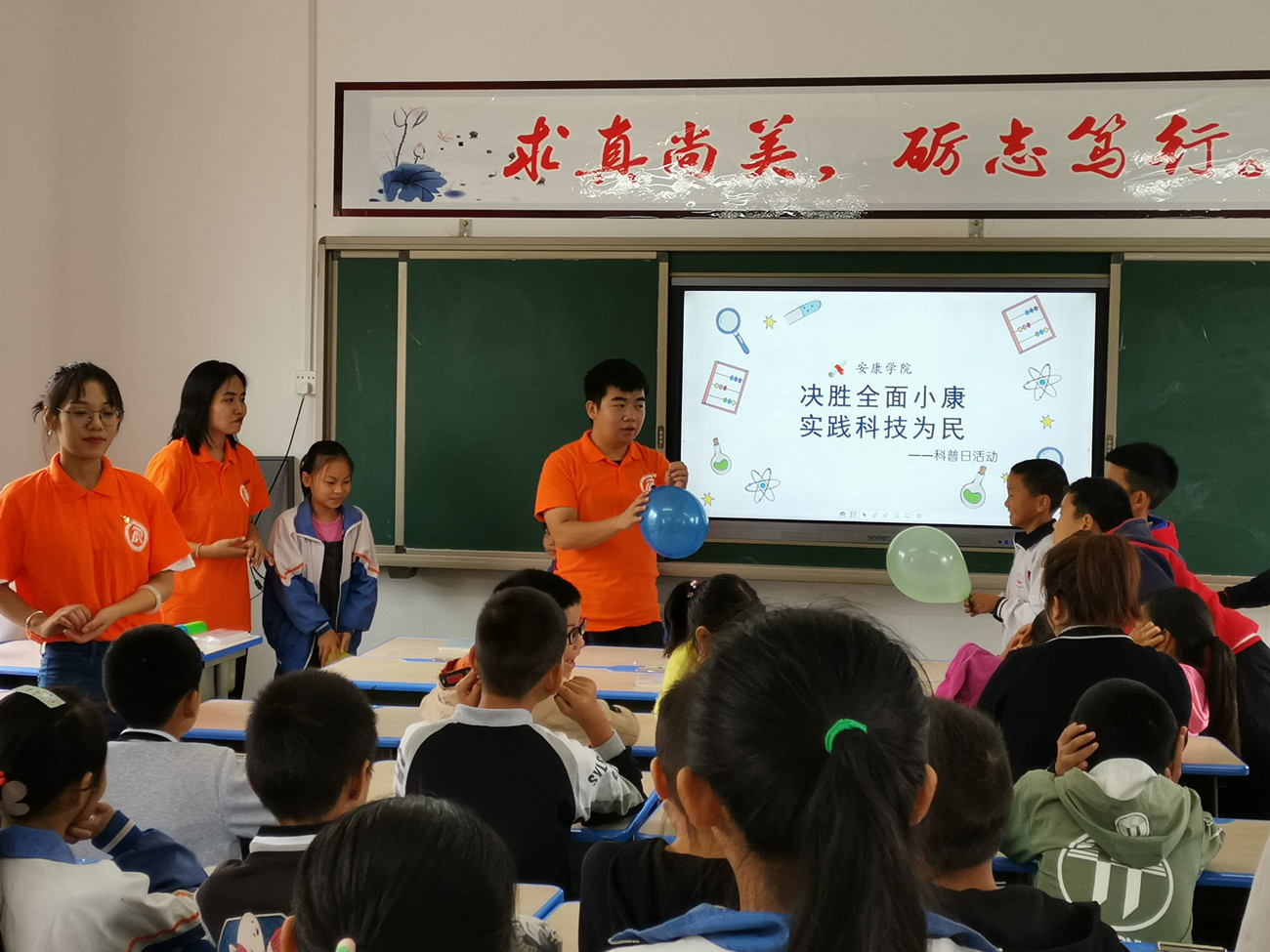 为深入贯彻习近平新时代中国特色社会主义思想,弘扬科学精神、普及科学知识、激发学生探索科学奥秘的兴趣。9月24日,我院紧贴“决胜全面小康、践行科技为民”主题,在汉滨区五里镇富强九年制学校展开了内容新颖、形式繁多的校园科普活动。