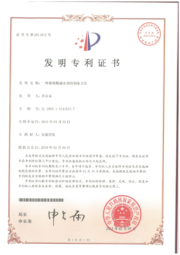 近日,我院许永东老师的国家发明专利《一种聚羧酸减水剂的制备方法》(专利号:ZL201510141517.7)通过协议定价的方式成功实现转化,该专利围绕聚羧酸减水剂的制备,研究出了一种高效的方法,专利技术被企业采用。