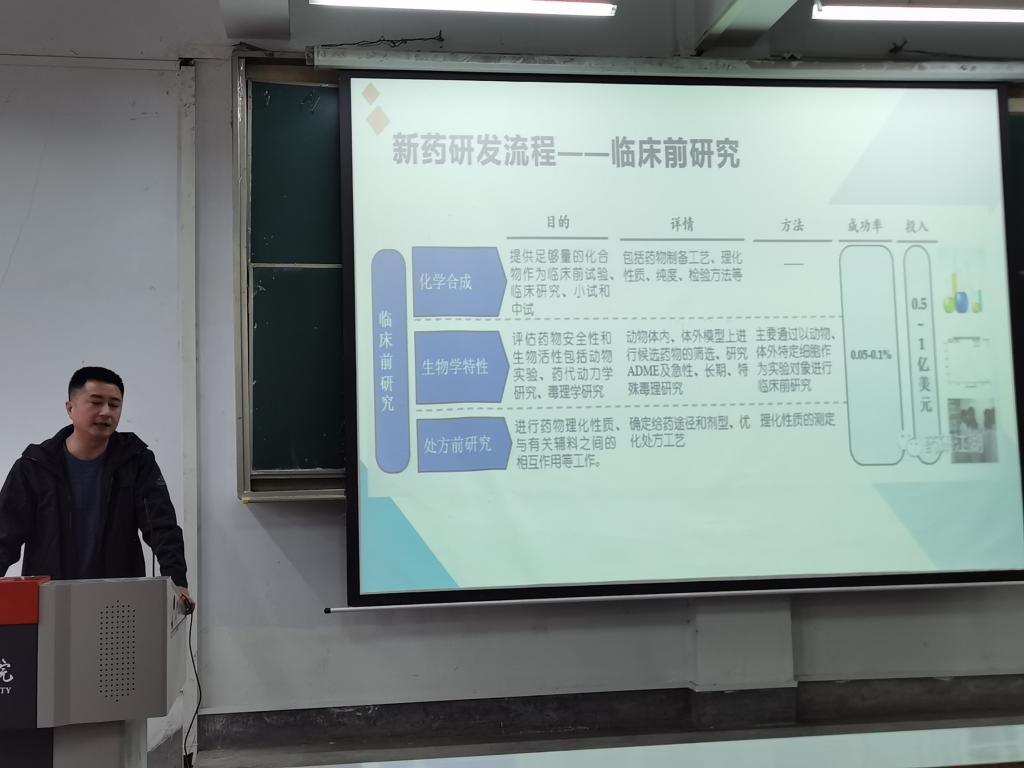 王国华高级工程师主要从新药研发流程和实例出发,解读和分析了我国新药创新研发的现状和存在的问题。他从事药品研发和生产管理工作多年,具有深厚的专业背景,以多年工作实践中积累的案例入手,从行业的角度讲授理论和实践内容,使学生产生了浓厚的学习兴趣,教学效果良好,学生反响强烈。