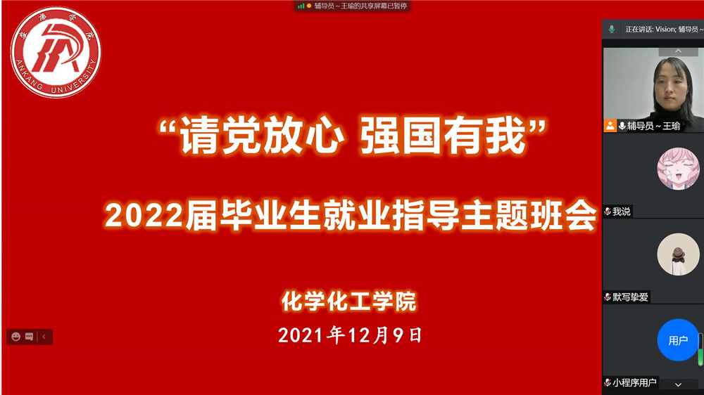 会上,毕业班辅导员王瑜老师首先就如何提高就业意识,怎样增加职场竞争力,向大家做了详细的讲解。希望同学们抓住2021年最后的1个月积极求职,主动就业。同时鼓励正在准备研究生入学考试的同学们调整好心态,乐观地做好最后的复习冲刺。