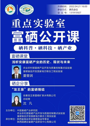 4月21日,学生集中线上直播观看了由安康市富硒产品研发中心举办的富硒公开课。农业农村部富硒产品开发与质量控制重点实验室夏曾润做了“浅析安康富硒产业的历史,现状和未来”的报告。安康龙王泉富硒矿泉水有限公司总经理沈凡做了“龙王泉的富硒情节”的报告。2018级应用化学、2021级应用化学专业学生参加。