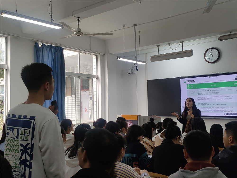 为了全力推进2023届毕业生高质量就业,构建毕业生与用单位的交流平台,推进就业指导工作落实落细。太阳成集团tyc7111cc采取“走出去,请进来”的方式邀请企业来校开展校园专场招聘。2023年3月10日上午,陕西巨子生物技术有限公司在一号楼1216教室举行专场宣讲会,同时线上分会场同步直播。