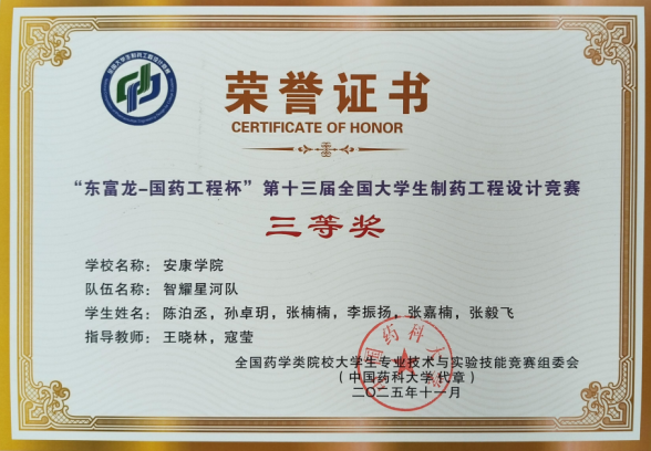 近日,由全国药学类院校大学生专业技术与实验技能竞赛组委会主办的“东富龙-国药工程杯”第十三届全国大学生制药工程设计竞赛圆满落幕。由我校教师王晓林、寇莹指导的学生团队“智耀星河队”(成员:陈泊丞,孙卓玥,张楠楠,李振扬,张嘉楠,张毅飞)凭借出色作品荣获三等奖。