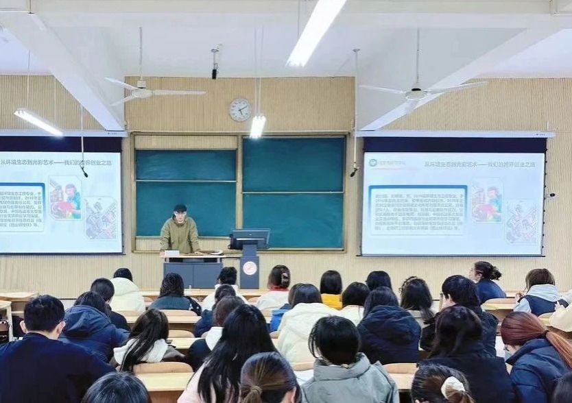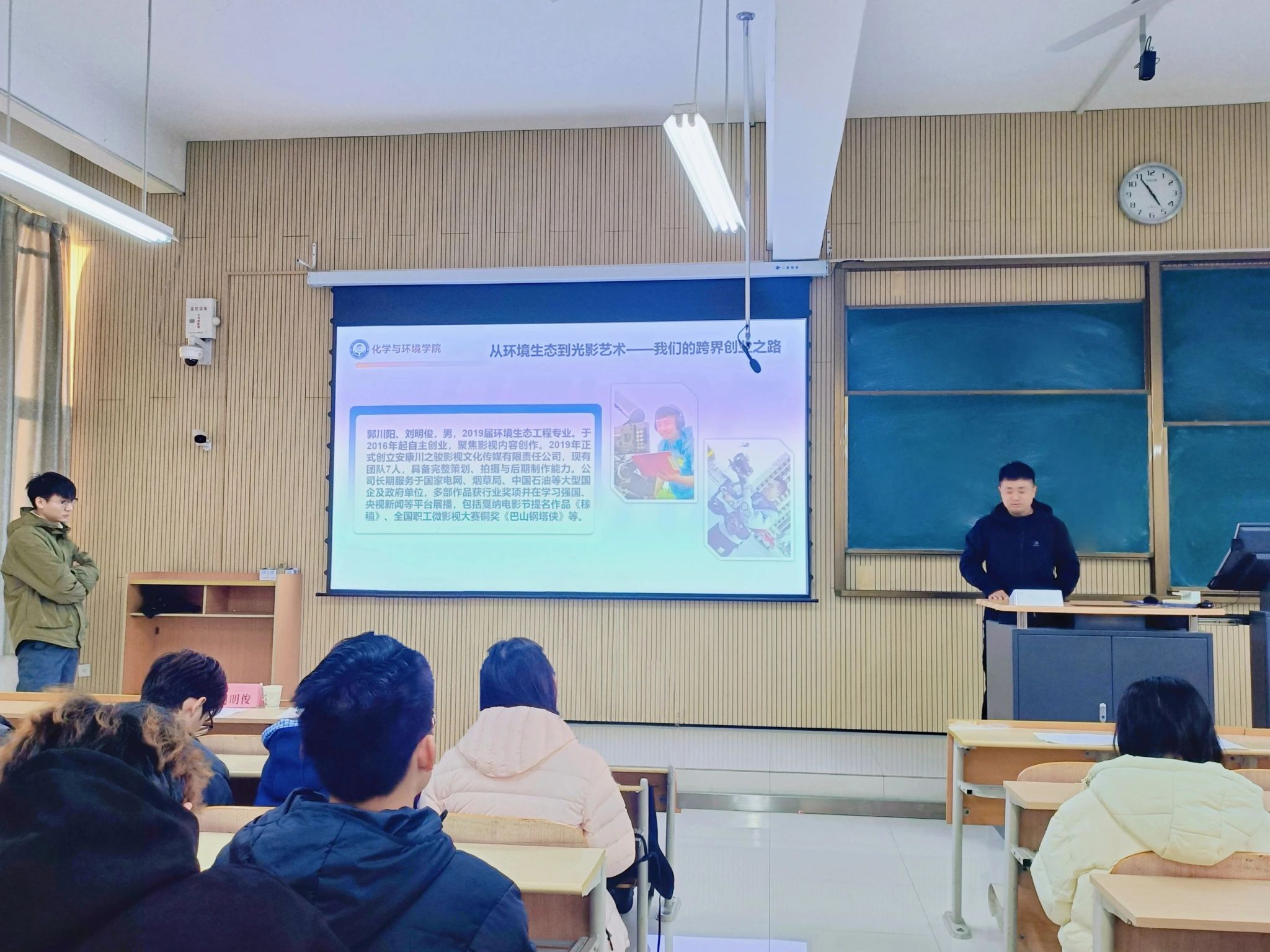 在专题分享环节,2019届环境生态工程专业校友郭川阳、刘明俊在1304教室面向本专业学生,作了题为“从环境生态到光影艺术——我们的跨界创业之路”的专题分享。二人介绍了如何将环境工程领域的系统性思维与项目管理能力,成功应用于影视文化传媒行业的创业实践,并分享了共同创立传媒公司以来,服务多家大型国有企业及政府单位、屡获行业认可的经历。现场同学积极提问,与两位校友进行了深入交流。