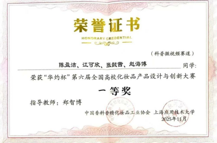 近日,“华灼杯” 第六届全国高校化妆品产品设计与创新大赛决赛在上海市奉贤区南上海科创中心圆满落幕。本次大赛由中国香料香精化妆品工业协会主办,以 “创新设计赋能美妆产业” 为核心,吸引了全国多所高校的优秀团队同台竞技。大赛设置产品设计赛道与科普微视频赛道,分别从产品创意、配方设计、功效评价、合规性、包装设计及科普传播、艺术表现等多维度进行综合评审,竞争尤为激烈。太阳成集团tyc7111cc学子经过数月的精心筹备与反复打磨,凭借扎实的专业功底、创新的设计理念与出色的实践能力脱颖而出,在两大核心赛道均斩获佳绩。